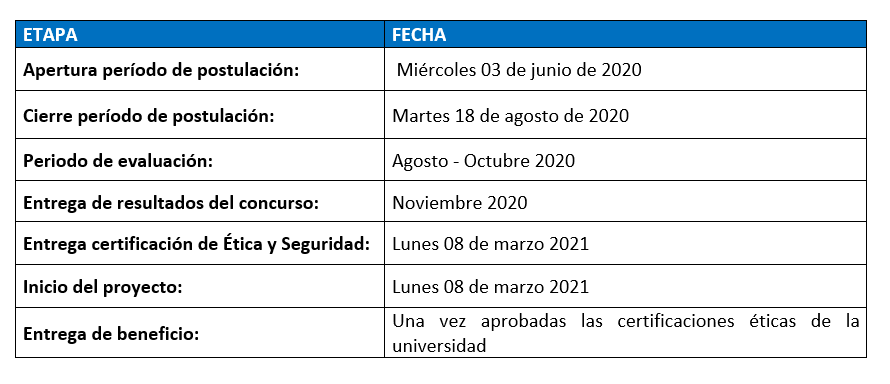 | Beneficios | - Monto máximo de $6.000.000 (seis millones de pesos), por un plazo de entre 12 a 18 meses, para financiar los siguientes ítems: honorarios para ayudantes de investigación, viajes y gastos de operación. Todos los montos deberán venir debidamente justificados en el presupuesto al momento de la postulación.